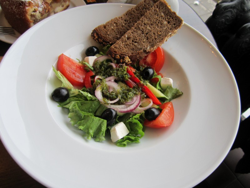 Сел с видом из окна-витрины. Посидел прекрасно! Хотя столик маленький, но и поднос и огромная тарелка с греческим салатом уместились на такой маленькой площади. По вкусу - салат греческий в пределах нормы, практически хорошо, хотя в Поле бывает и лучше. Капучино и макарунс на все пять. Чай и пирог швейцарский на пять с плюсом.