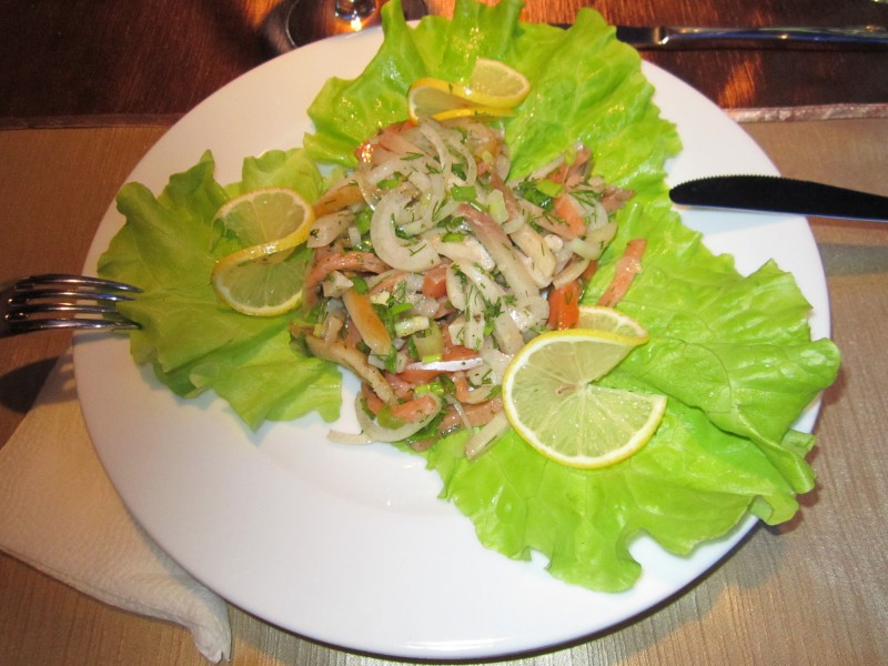 Меню, думаю, буду ещё изучать и изучать. Оно, пожалуй, неровное, нуждается в совершенствовании. Вот, салатик Морской - получился слишком простым, слишком без каких-либо изысков, а, между прочим, стоит 280 рублей. Могло бы быть поизысканней, а так с салатом - типовая ситуация для заведений с кавказской кухней. Приятные исключения случаются редко. Гораздо больше мне понравился лангет на горячее. Можно сказать, что просто понравился. Вкусно и сытно, хотя я бы предпочел печеный картофель вместо фри, но что есть. Здесь ставлю отлично.