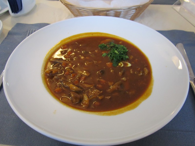 Итак, о моём заказе. Салатик греческий сделан скромно, но добротно, а можно и наоборот сказать. Цена очень скромная - 140 рублей. Далее суп-гуляш с говядиной - хороший сытный приятных вкусовых качеств. Не пожалел, что заказал. Горячее - куриное филе в беконе и вовсе не подкачало. Некоторые проблемы, сути которых я так и не понял, возникли с тортом "Арабская ночь". Надеюсь, в следующий раз такое не случится.