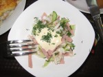 Несколько не устраивает ассортимент салатов. Для меня выбор оказывается несколько трудноват по соотношению состава и цены. В этот раз взял "пекинский" (60 рублей). Зато никаких проблем с горячим и, конечно же с выпечкой. Горячее в моём случае - филе куриное, запеченное под сырной корочкой (80 рублей), что абсолютно недорого, если при этом ещё учесть гигантский размер порции. Макароны в виде гарнира (35 рублей).