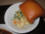 В последний раз брал гуляш (75 рублей) и рис Мозайка (50 рублей), салатик Деревенский (45 рублей), морс ягодный (25 рублей), чай (20 рублей). Как всегда можно свежей разнообразной выпечки. Конечно же, не удержался, взял пирожок с луком и яйцом (30 рублей), размер немаленький, наполнение хорошее, так что, цена вполне оправданная. К чаю сладкоежка не смог себе отказать в пирожном - 50 рублей, свежайший продукт.